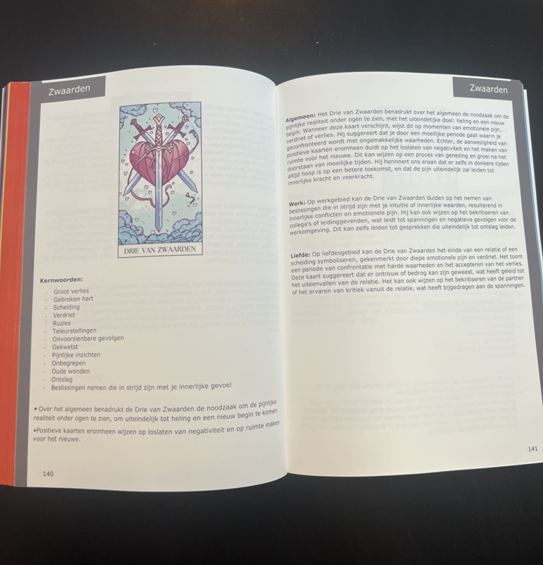 Het boek is volledig in kleur en overzichtelijk opgebouwd. Elk onderdeel heeft een eigen kleurstrook, zodat je snel ziet met welke kaarten je werkt. De Grote Arcana, de Kleine Arcana en de suites Staven, Munten, Zwaarden en Kelken zijn daardoor makkelijk terug te vinden.